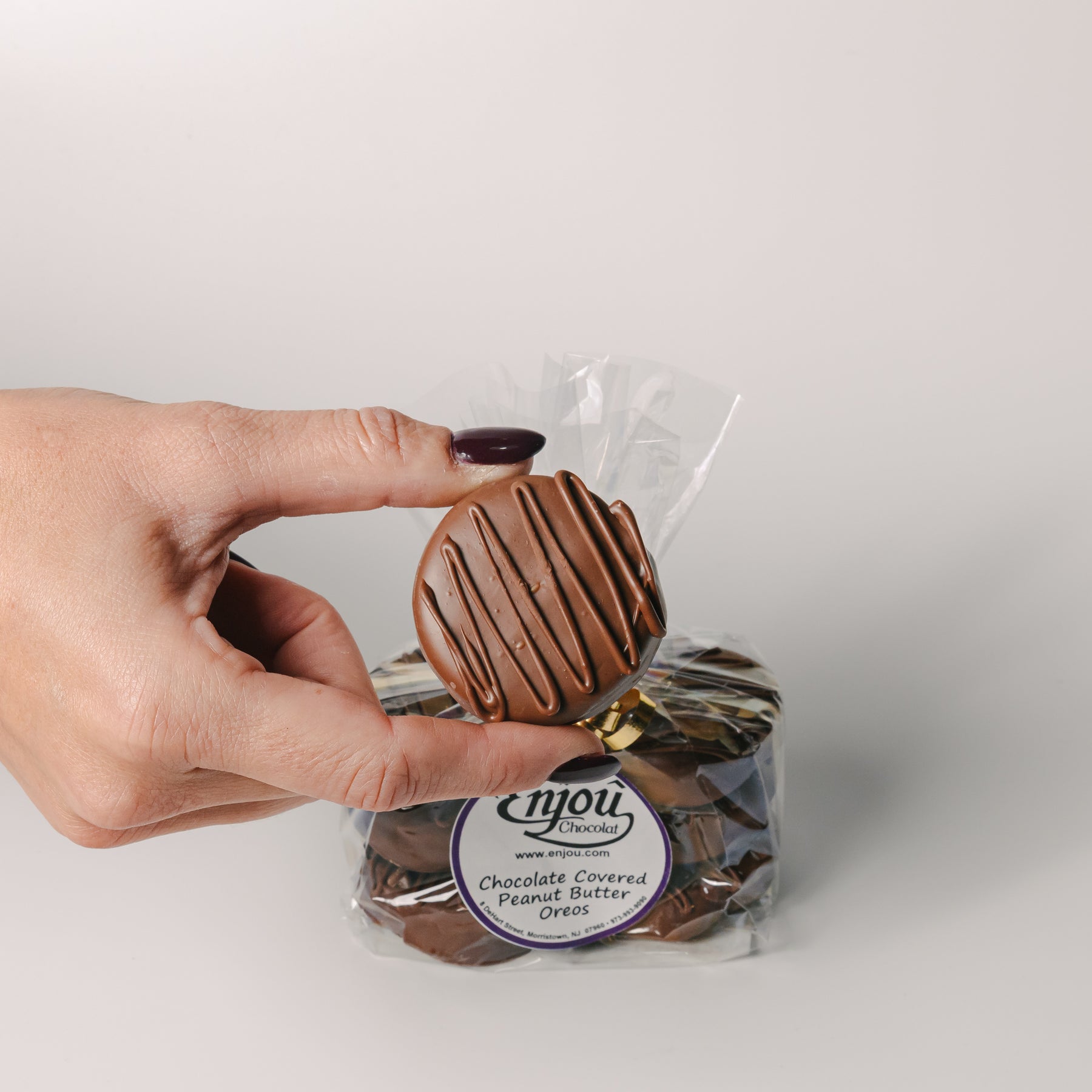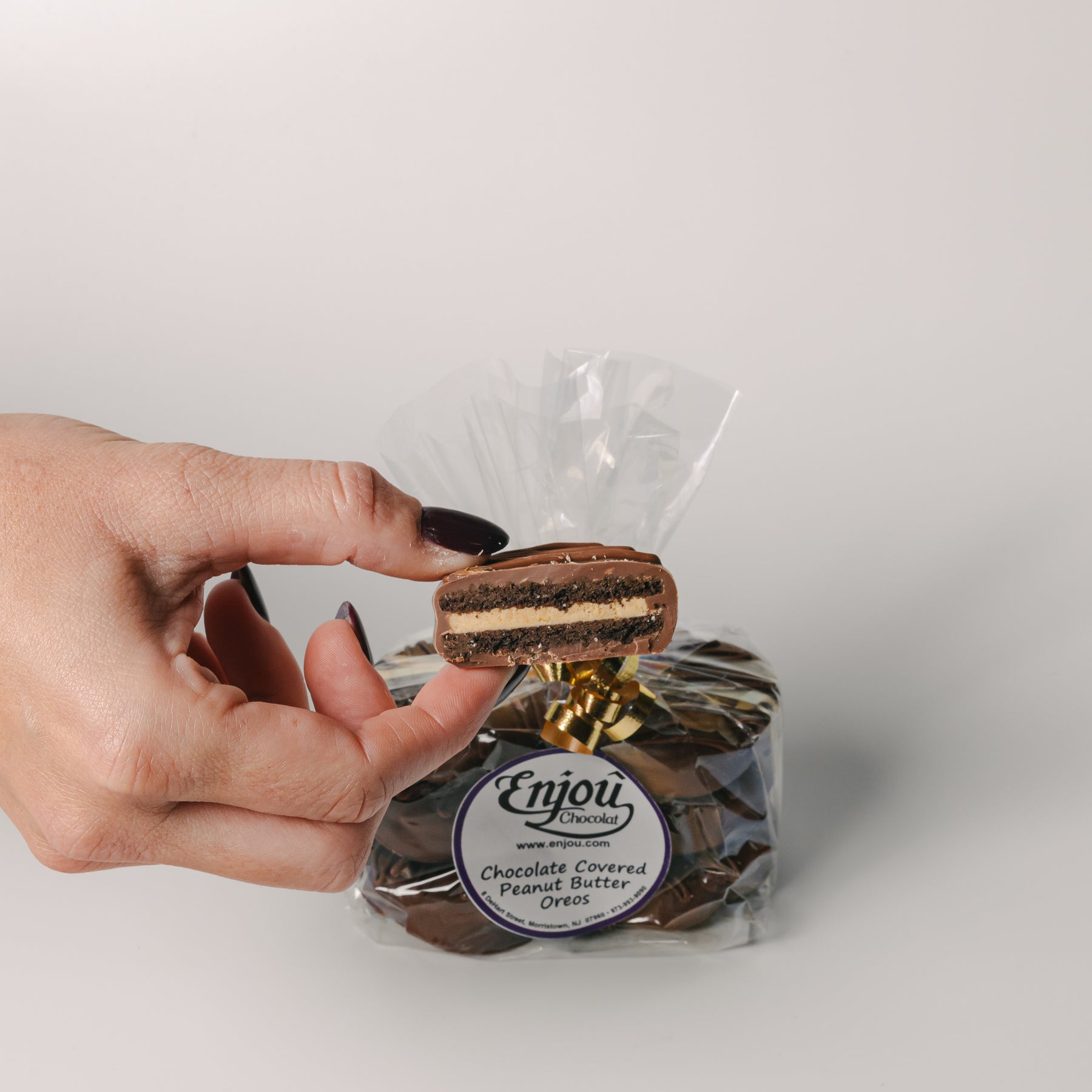 Get ready for a mouthwatering experience with Enjou's peanut butter chocolate covered Oreos! These delicious treats feature the perfect combination of peanut butter flavoring sandwiched between a crisp Oreo and smooth milk chocolate. A delectable snack for any occasion.