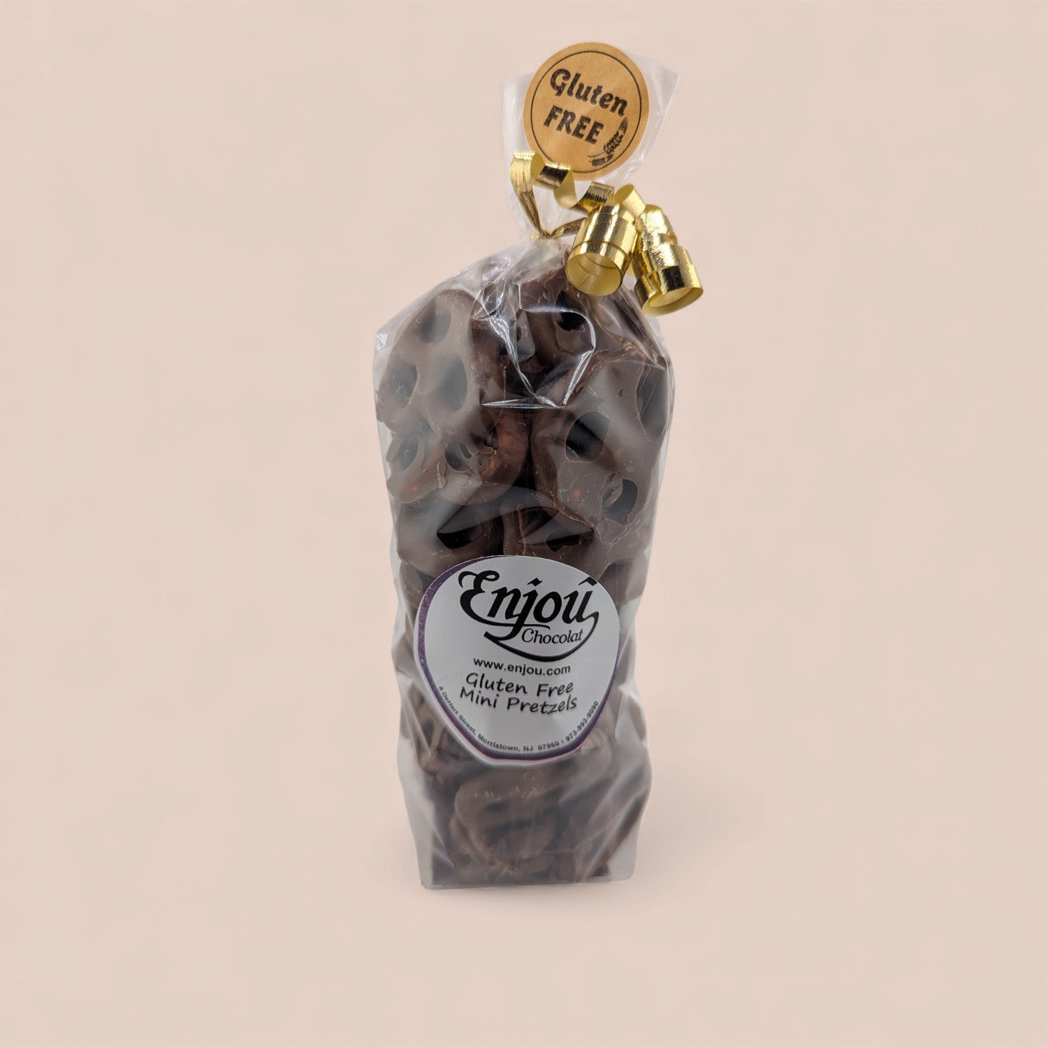 Introducing Enjou's gluten-free chocolate-covered pretzels. Enjou's famous chocolate-covered pretzels now made with gluten-free pretzels. Now you too can enjoy the amazing treat you've seen your friends and family have. 6.8 oz.
