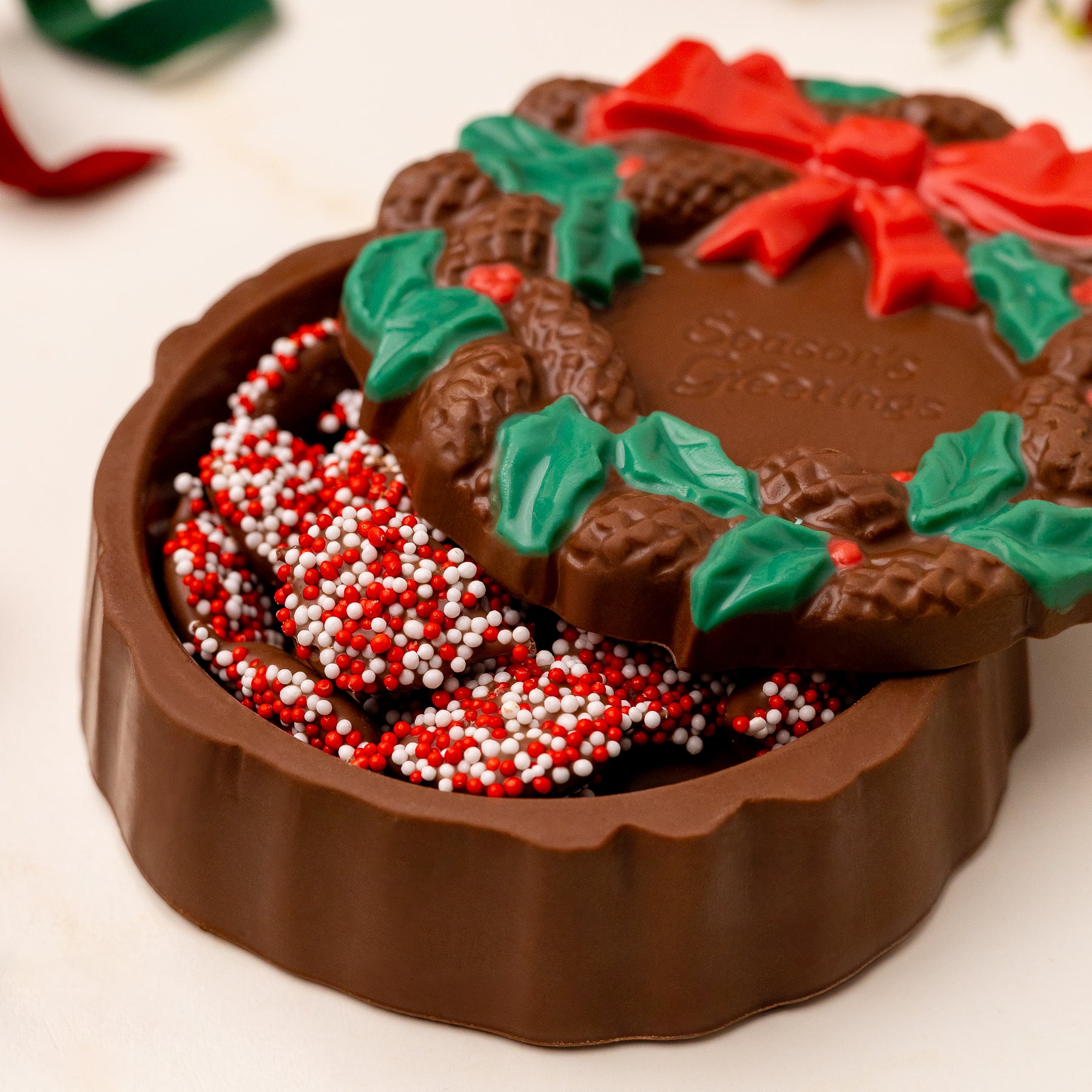 Celebrate the season with sweetness! This charming chocolate box, topped with an intricately detailed wreath-decorated lid, is filled with festive nonpareils—making it the perfect gift to share joy and indulgence. Measures approximately 3.75 inches in diameter.