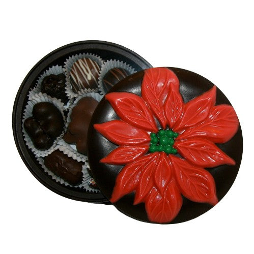 Crafted entirely from Enjou’s rich, homemade chocolate and topped with an elegant poinsettia, this festive keepsake opens to reveal an indulgent assortment from our Connoisseur Collection. A decadent gift that’s as beautiful as it is delicious. Measures approximately 5.25 inches in diameter.