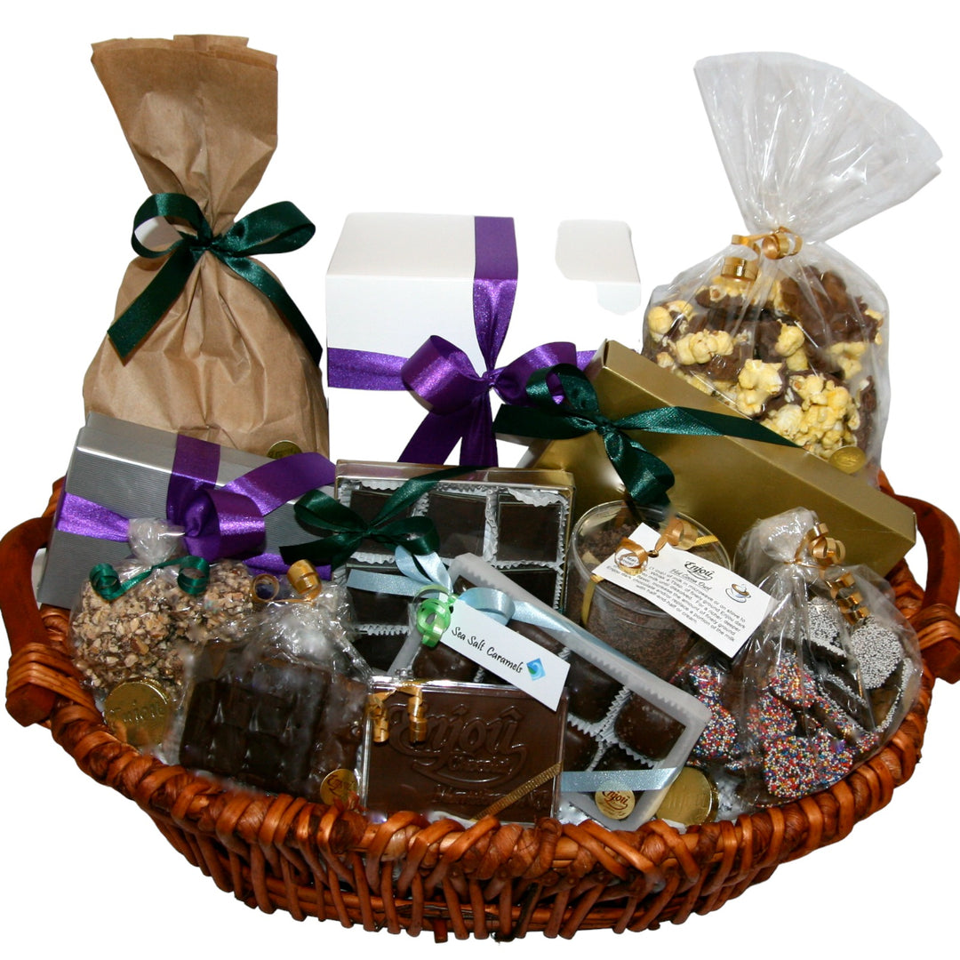 No matter the occasion, Enjou's Traditional Basket line has everything you need. From our gourmet assorted chocolates to hand-dipped Oreos, chocolate covered pretzels and graham crackers, almond buttercrunch, and some minty delights, there's something for everyone. Plus, with decadent truffles, nonpareils, nuts or cordials, (and don't forget an Enjou chocolate bar!), this basket is sure to please. Ingredients and container may slightly vary, but the sweetness is guaranteed!