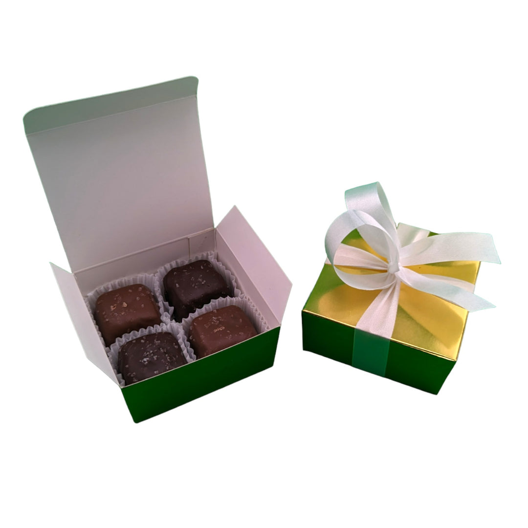 Treat yourself (or someone special) to our 4-piece box of sea salt caramels- an elegant gold or white favor box filled with an Enjou best seller. These are the perfect balance of sweet and savory, creating a mouthwatering combination guaranteed to satisfy your cravings or delight your guests.