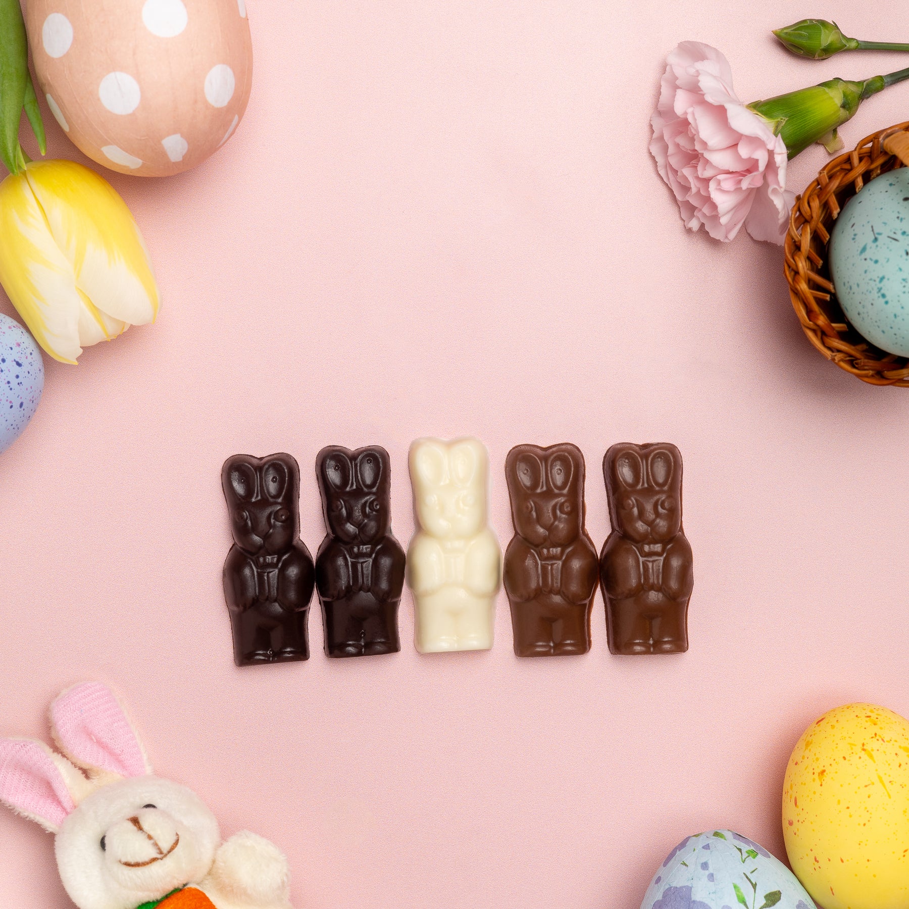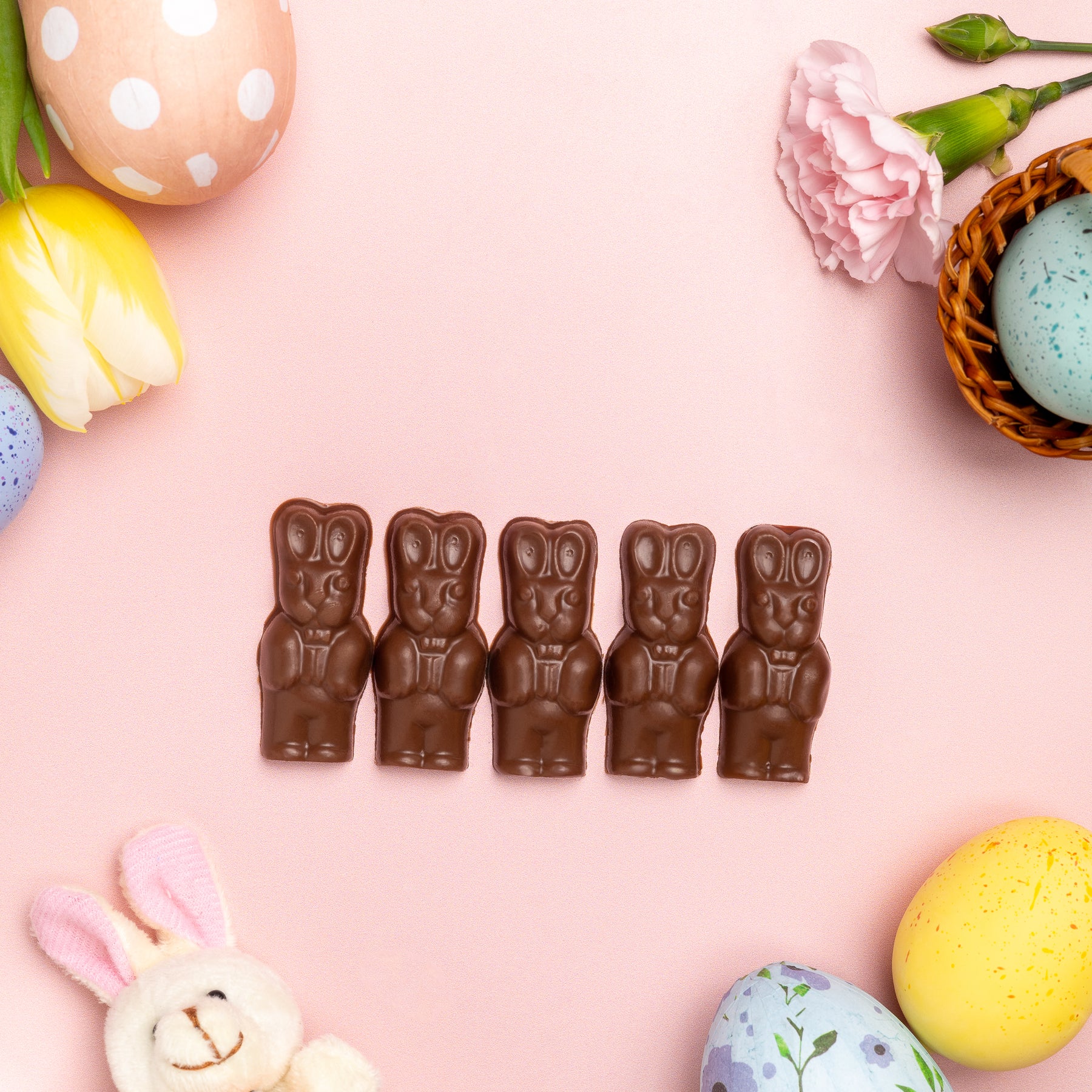These adorable mini chocolate bunnies come in a clear cellophane bag, making them a sweet and festive treat for Easter. Individually molded from Enjou's rich, homemade chocolate, they’re the perfect bite-sized delight to fill baskets, share with friends, or enjoy as a little chocolate surprise. A charming addition to any Easter celebration! Each bunny measures approximately 2 inches.