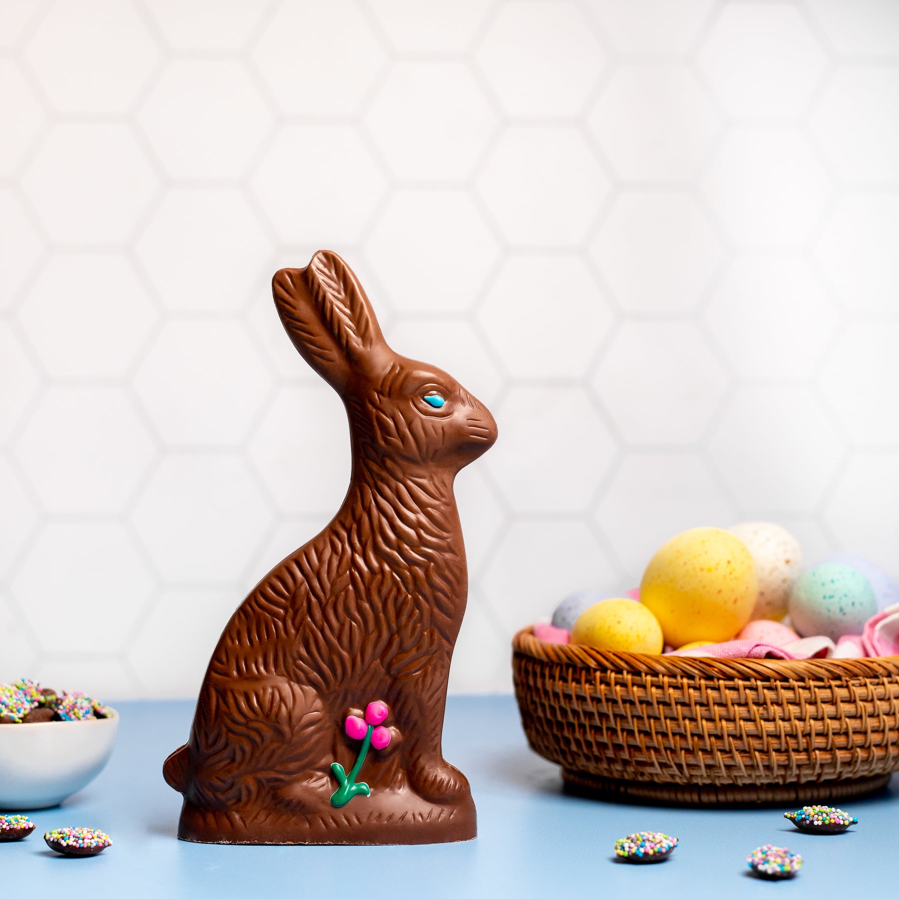 Hop into the Easter spirit with this classic solid chocolate Easter bunny, standing at 8.5 inches tall and weighing approximately 15 oz. Satisfy your sweet tooth with this timeless treat or toss it in a basket!