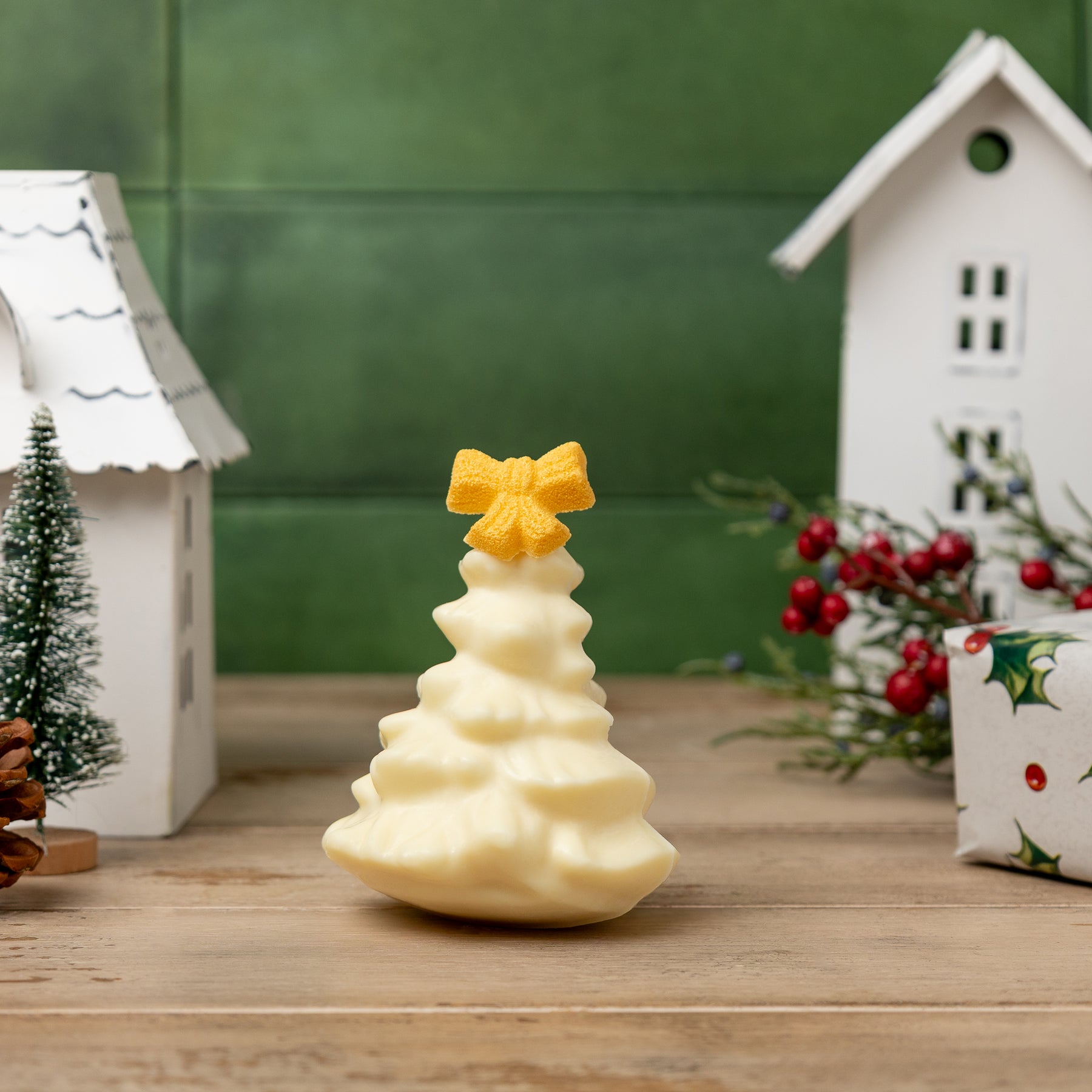 Beautifully molded with intricate detail and topped with a charming bow, this elegant holiday treat makes a stunning gift or place setting. Crafted from Enjou's rich, homemade chocolate, it’s a sweet way to share Christmas cheer. Measures approximately 5 inches tall.