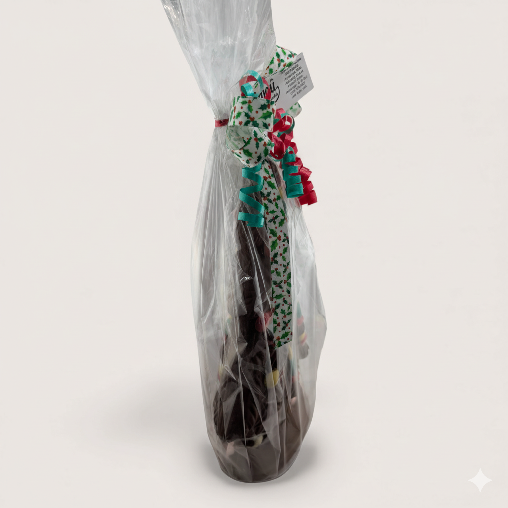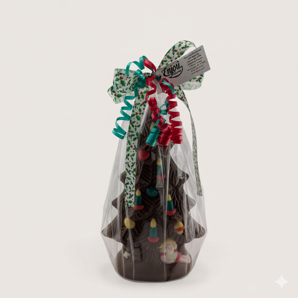 Deck the halls with an almost foot-high Christmas tree from Enjou. Made from our milk, dark, or white chocolate and decorated for the holiday season.  11" tall by 7" wide and about 3.5" at it's thickest.  Decorated fully on both sides.  Weighs about 1.75lbs.