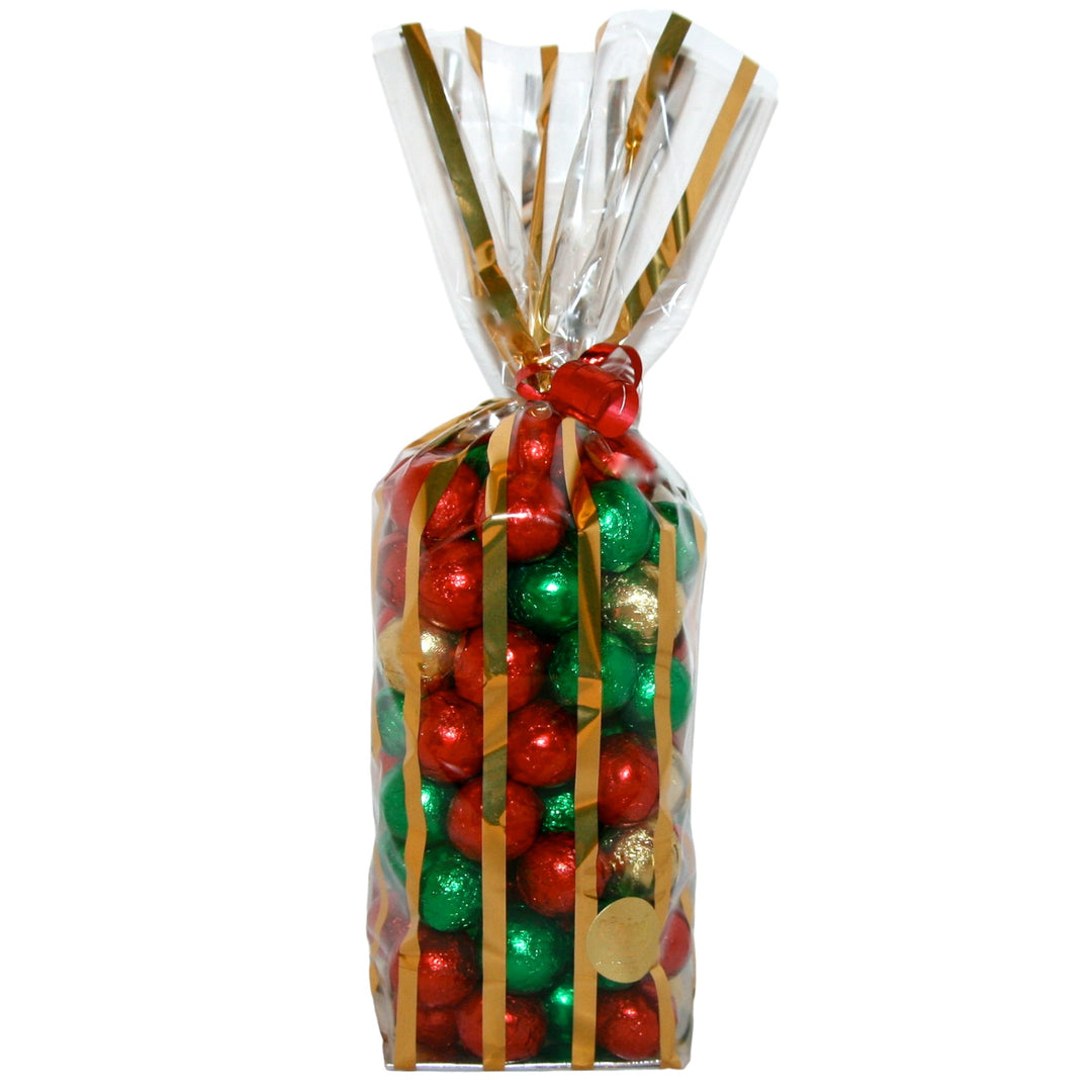 Add a touch of sweetness to the season with these Christmas foil-wrapped milk chocolate balls. A one pound bag of creamy, melt-in-your-mouth chocolate is wrapped in festive, ornament-inspired foil—perfect for decorating candy dishes, stuffing stockings, or adding sparkle to holiday gift baskets. Delicious, decorative, and delightfully festive!