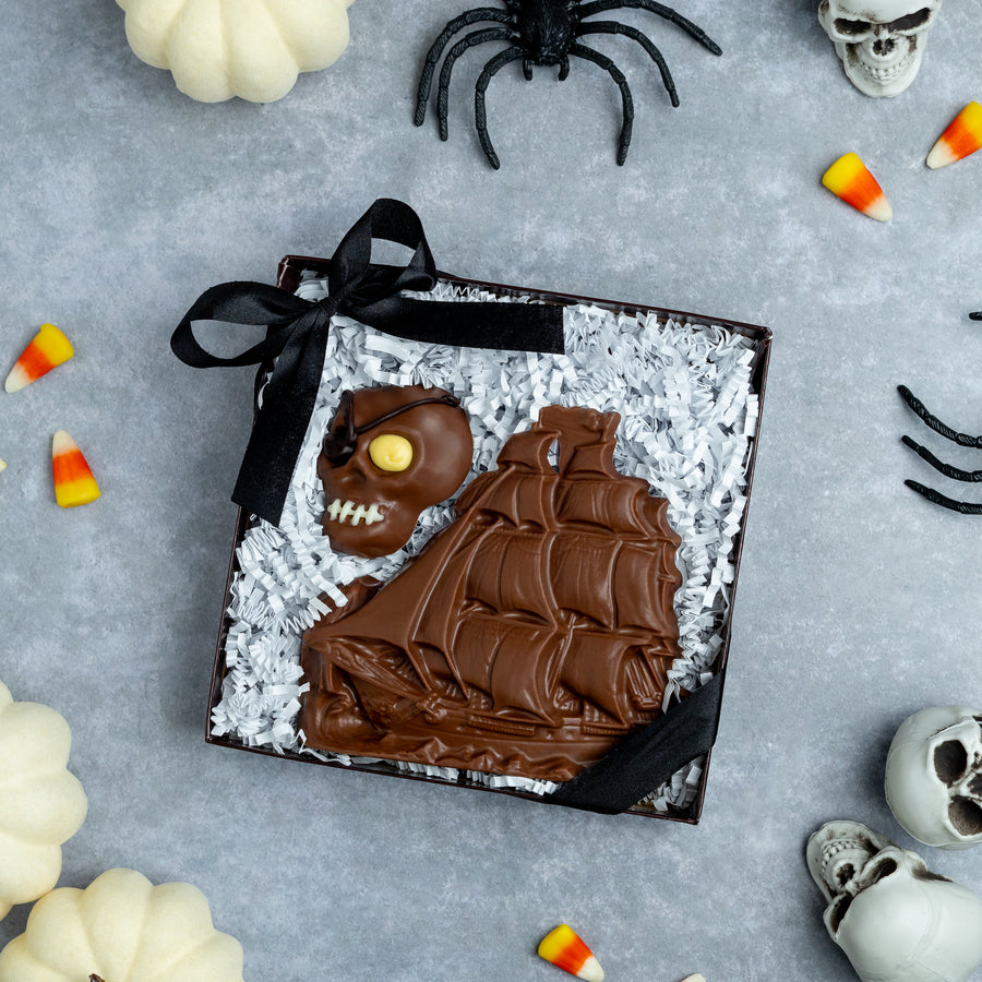 Sail ho! No need to plunder and pillage for this chocolate booty! A chocolate pirate ship and pirate's skull to add to your coffers!!! The skull measures approximately 2.25 inches long.