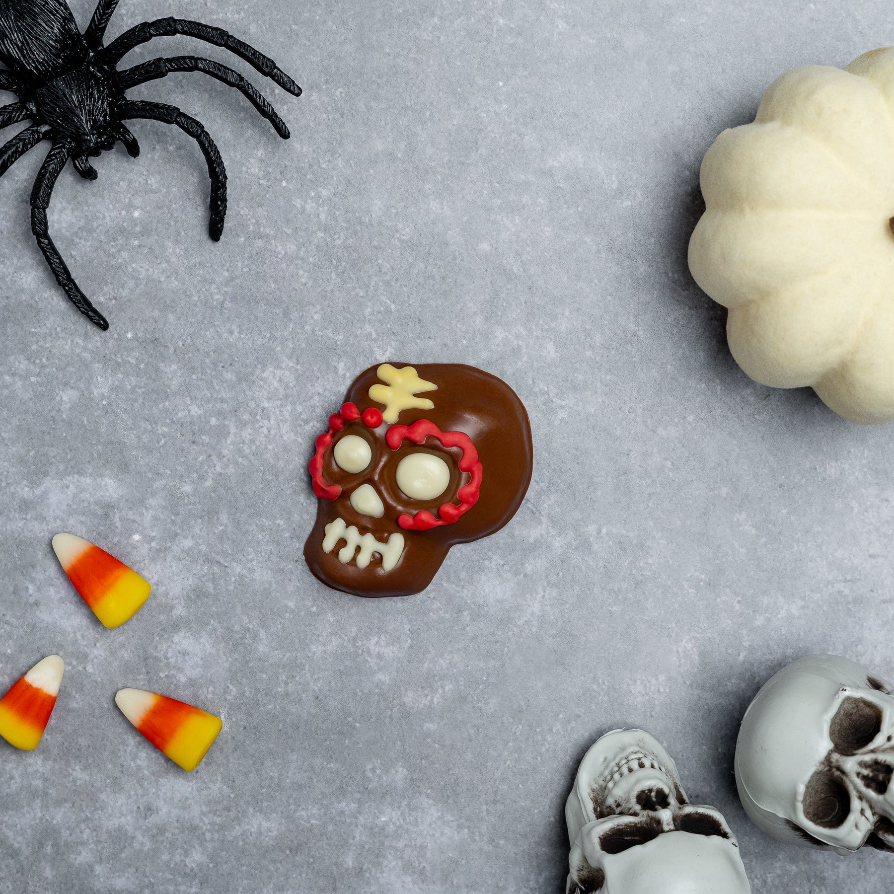 Indulge in some hand-decorated, original treats with Enjou's Day of the Dead skulls! These chocolate skulls are perfect for celebrating spooky season with a touch of sweetness. Perfect for Dia de los Muertos party favors or place settings. Measures approximately 2.25 inches long.