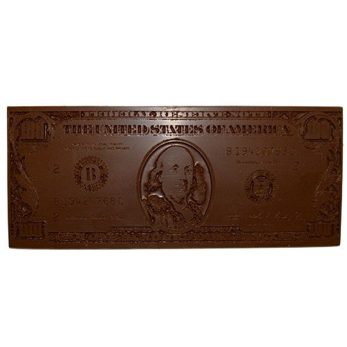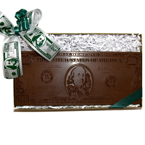 Solid chocolate hundred-dollar bill ... worth every penny! Measures approximately 9.5 inches by 4 inches.