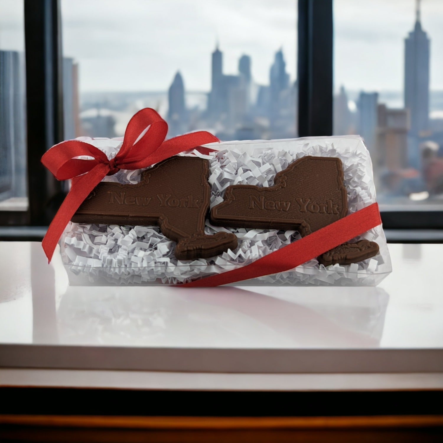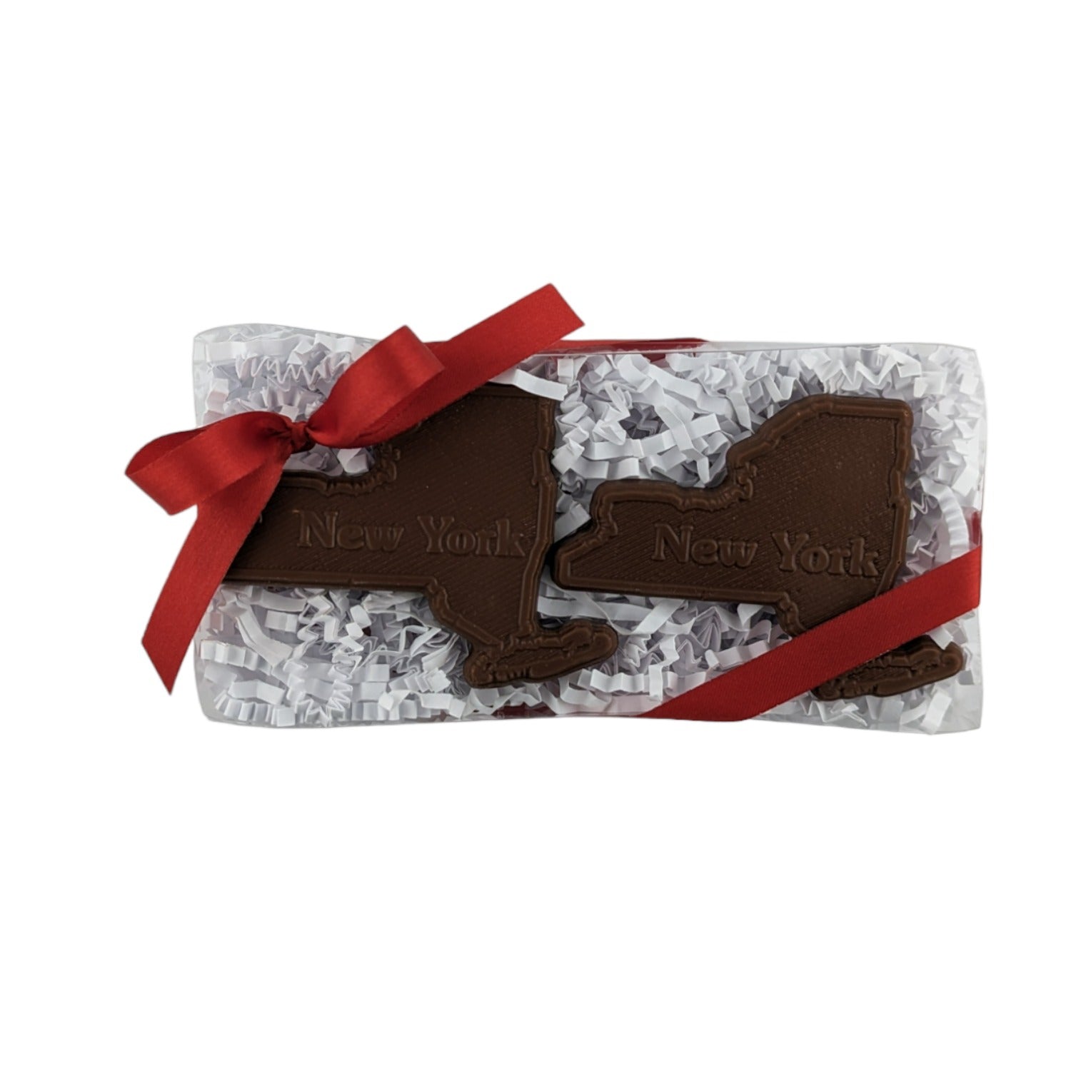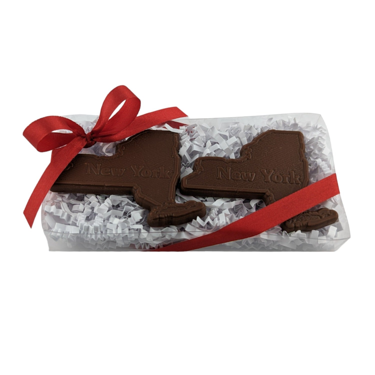 Two New York State-shaped chocolates in a beautiful gift/favor box. Appx 2.5" wide by 2" tall.