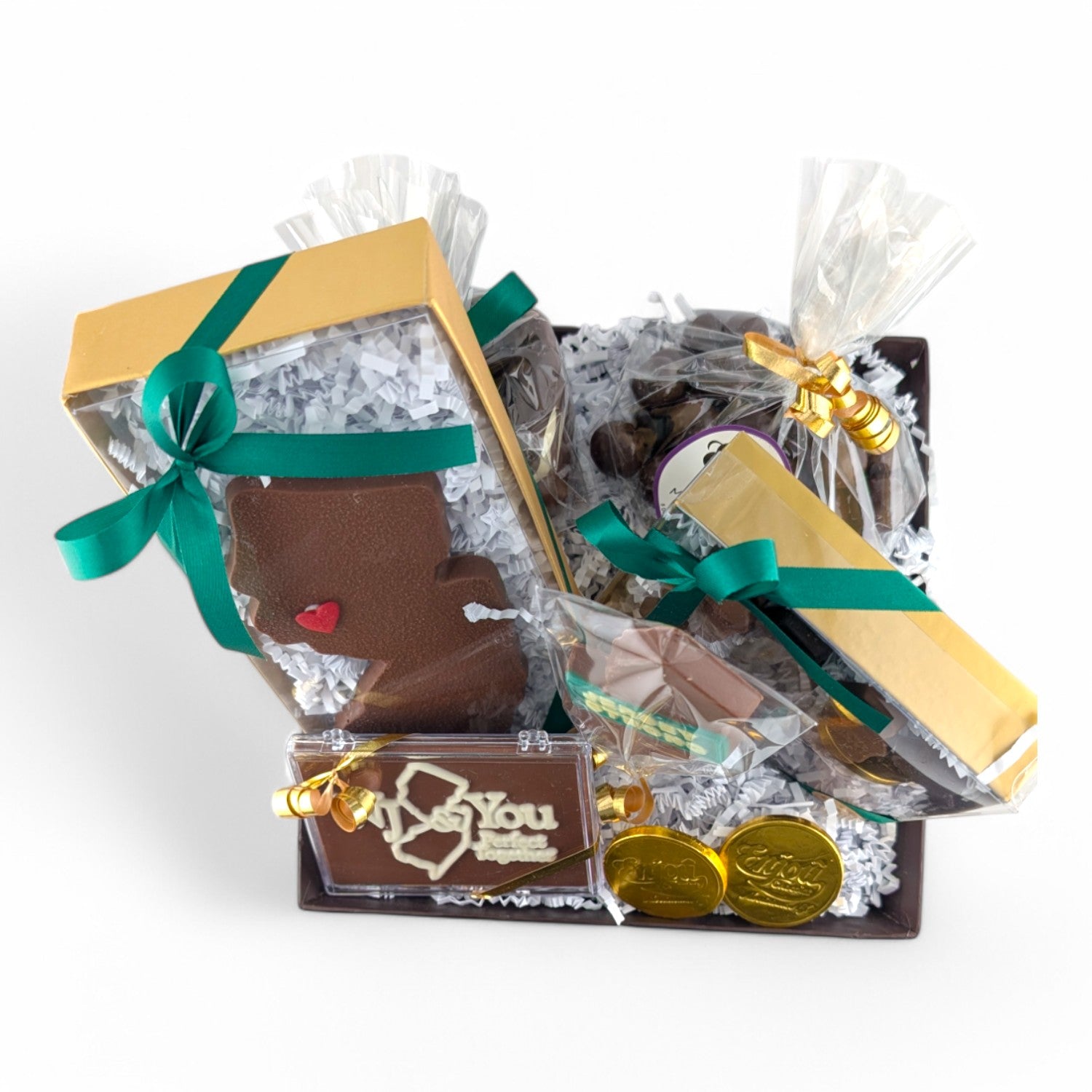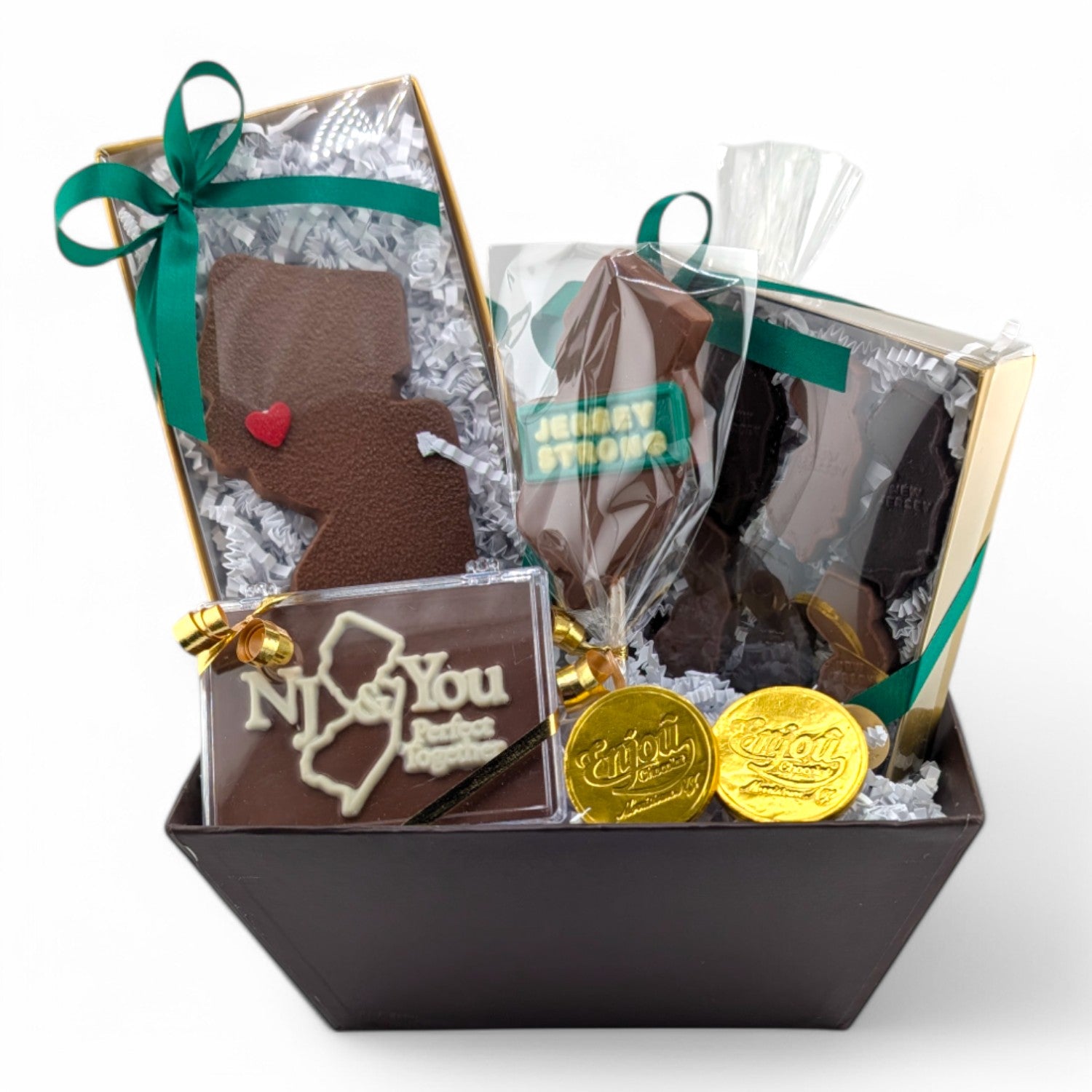The heart of Enjou Chocolat resides in New Jersey, the beautiful Garden State. A perfect gift for visitors, or those who call it "Home". This gift box filled with a variety of treats will surely delight the most discerning chocolate lover. Contains Jersey Strong lolly, Large NJ state with heart, NJ & You calling card, NJ state Pieces, Enjou foiled coins, Chocolate Covered mixed pretzels, and Enjou Cordials (chocolate filled with flavored liquid centers). Style of basket may vary.