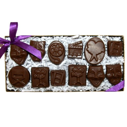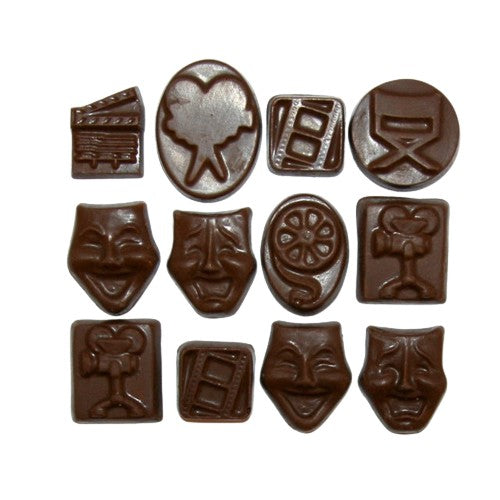 Twelve pieces of movie-affiliated chocolates: including the comedy/tragedy masks, director's chair, film strip, film reel, movie camera and more...
