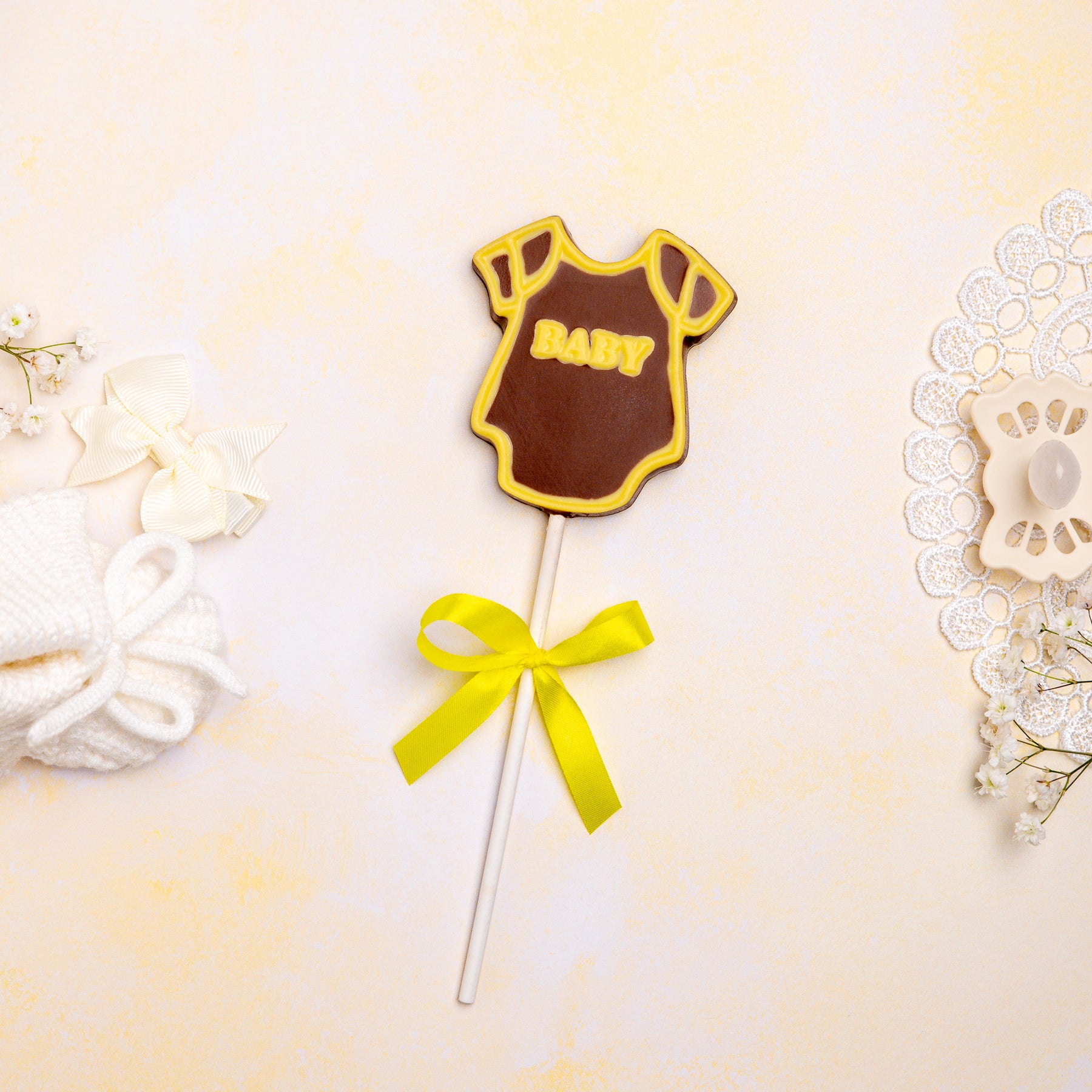 Delightfully sweet and irresistibly cute, this chocolate onesie lollipop comes in shades of pink, blue, and yellow. A perfect baby shower favor or a charming gift to celebrate the arrival of a precious little one. Measures approximately 2.75 inches long.