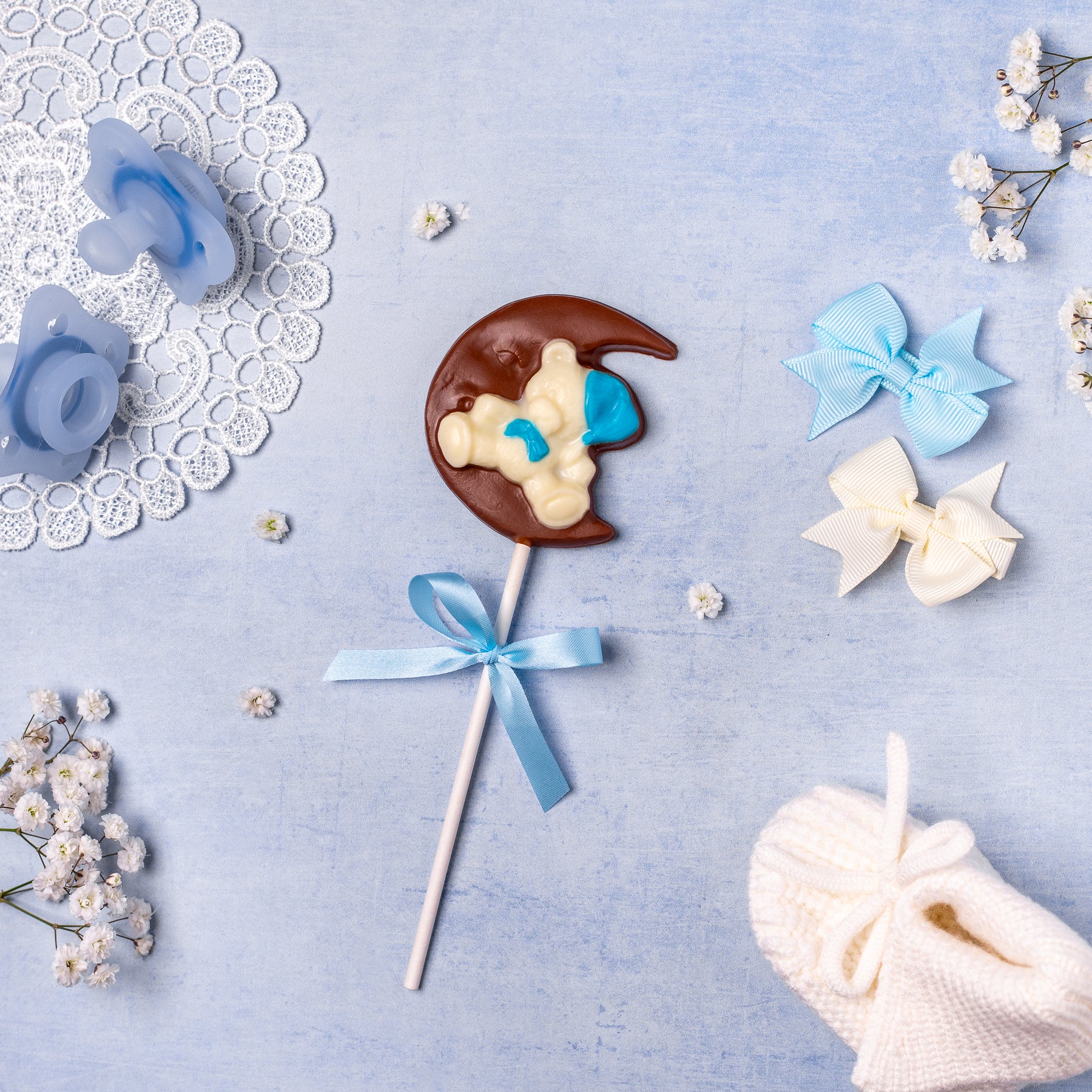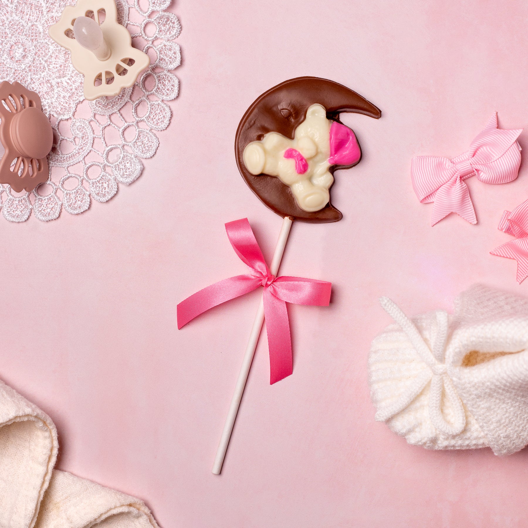 Delightfully sweet and irresistibly cute, this teddy bear on the moon chocolate lollipop comes in shades of pink, blue, and yellow. A perfect baby shower favor or a charming gift to celebrate the arrival of a precious little one. Measures approximately 2.5 inches long.