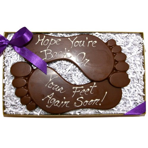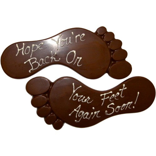 Chocolate Feet with the inscription, "Hope you're back on your feet again soon." Each foot measures approximately 3.75 inches by 7 inches long