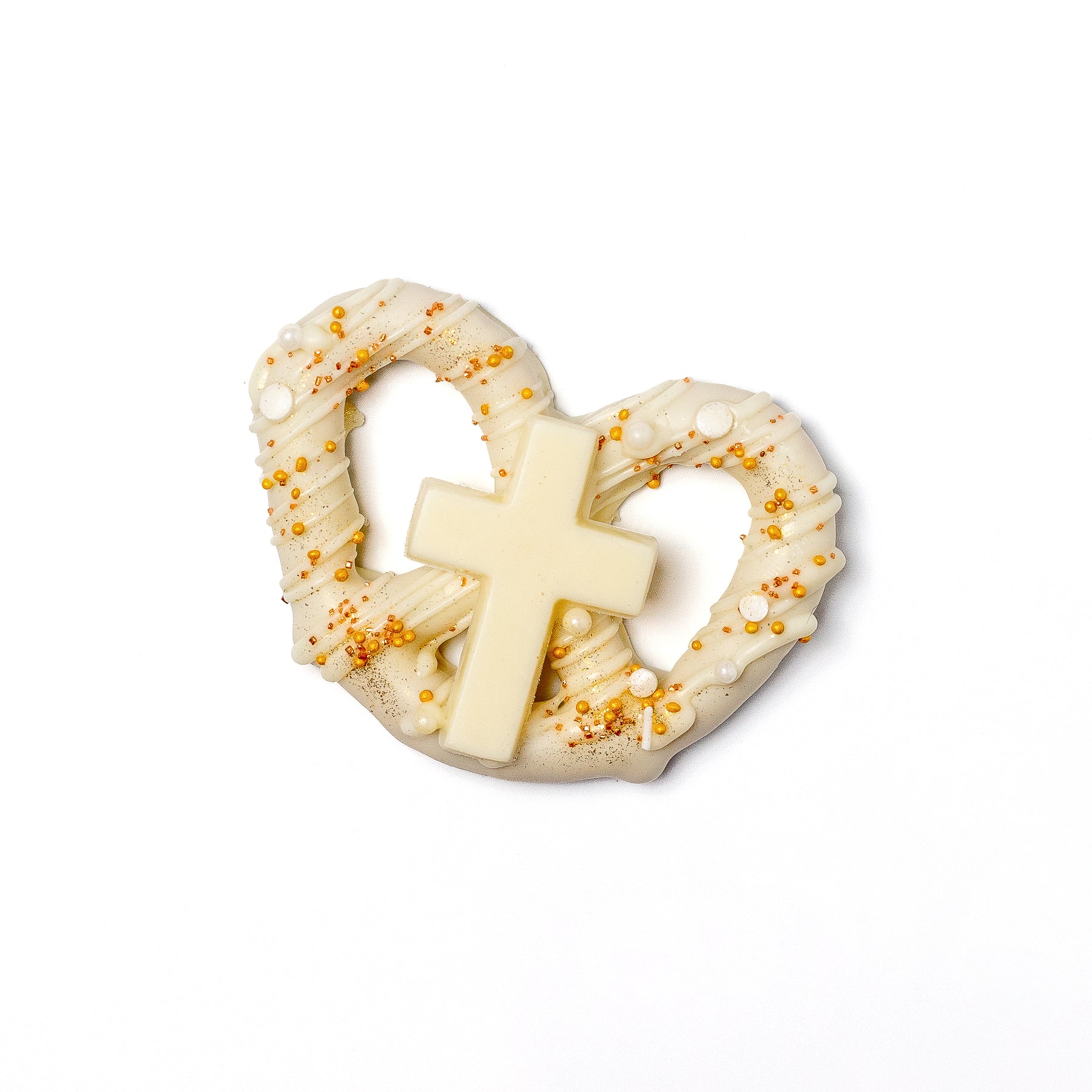 Celebrate sweet blessings with our intricately designed pretzel cross favor- a handcrafted pretzel dipped in Enjou's rich, homemade chocolate, adorned with sprinkles and pearls, and topped with a religious cross in the center. Perfect gift or favors for Christenings, Communions, and Confirmations!