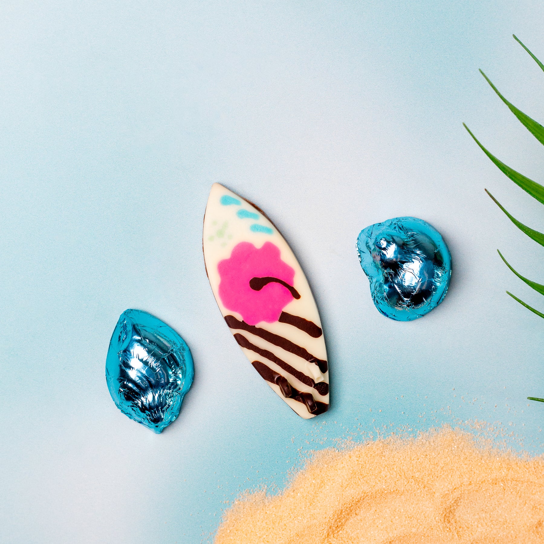 Bring on the beach vibes with this chocolate surfboard, adorned with delicately hand-drawn graphics. Paired with two foiled chocolate seashells, it’s the perfect favor for a beach-themed party or a sweet gift for your favorite surfer. Dive into delicious fun!