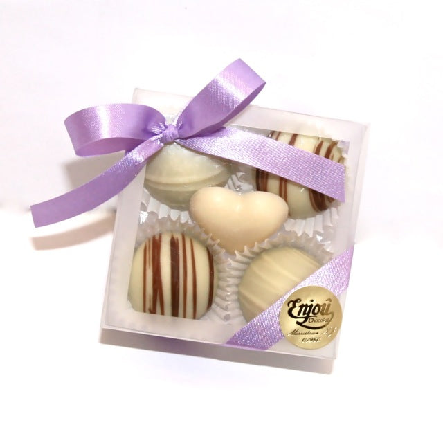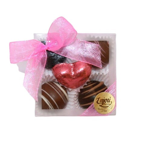 Clear lidded box filled with four of Enjou's decadent truffles. Besides the four truffles, it includes an Enjou foiled chocolate heart.  Personalize with a custom printed tag or printed ribbon at an additional charge.