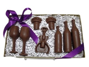 This Chocolate Wine Set comes complete with Bottles, Glasses, Corks and more! The corkscrew measures approximately 3 inches tall, and the glasses each measure approximately 3.5 inches tall