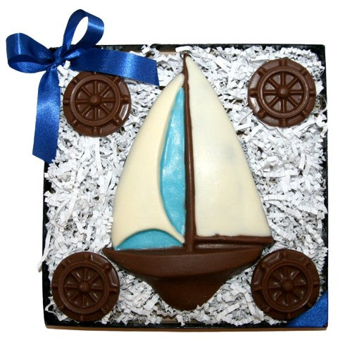 Welcome aboard! Captain your own boat with this chocolate sailboat and ship's wheels. Boat measures approximately 4.25 inches by 6.75 inches tall