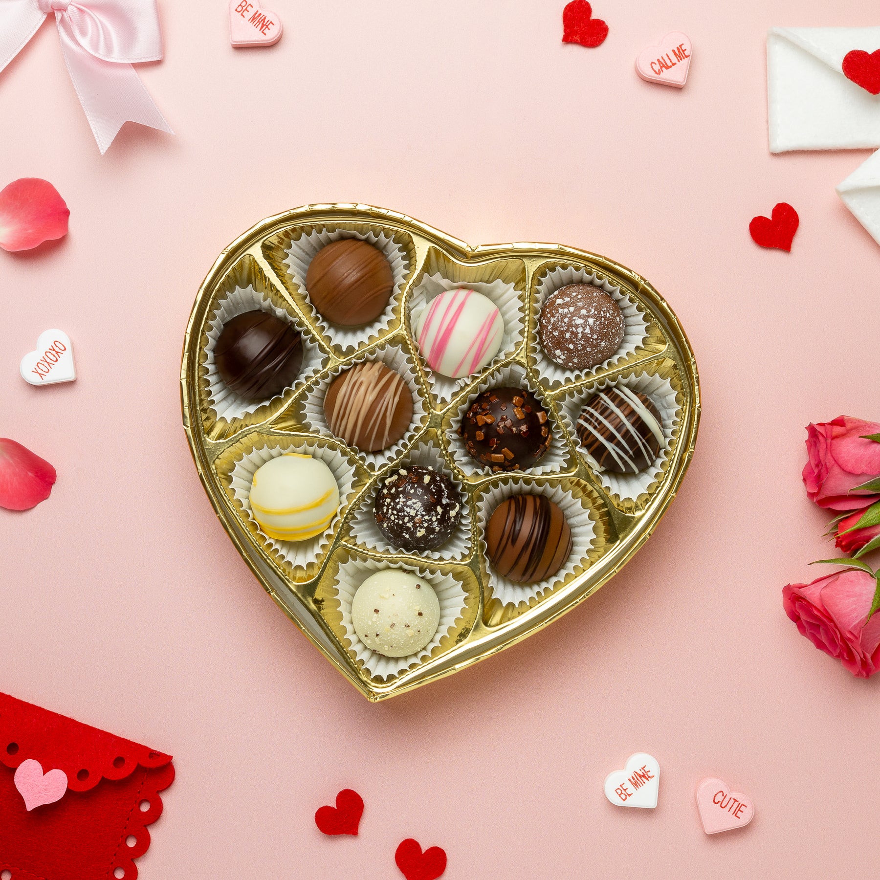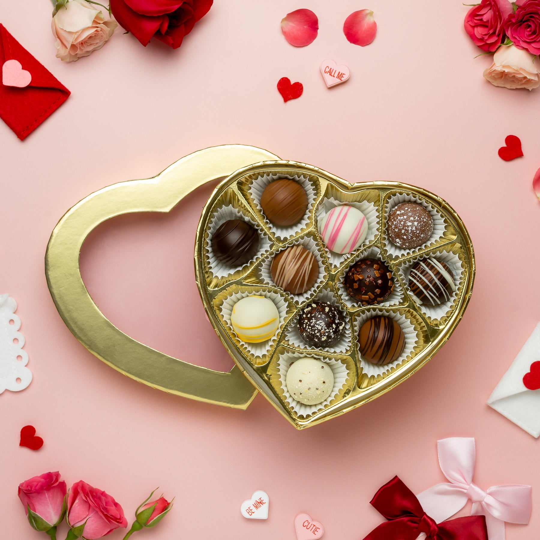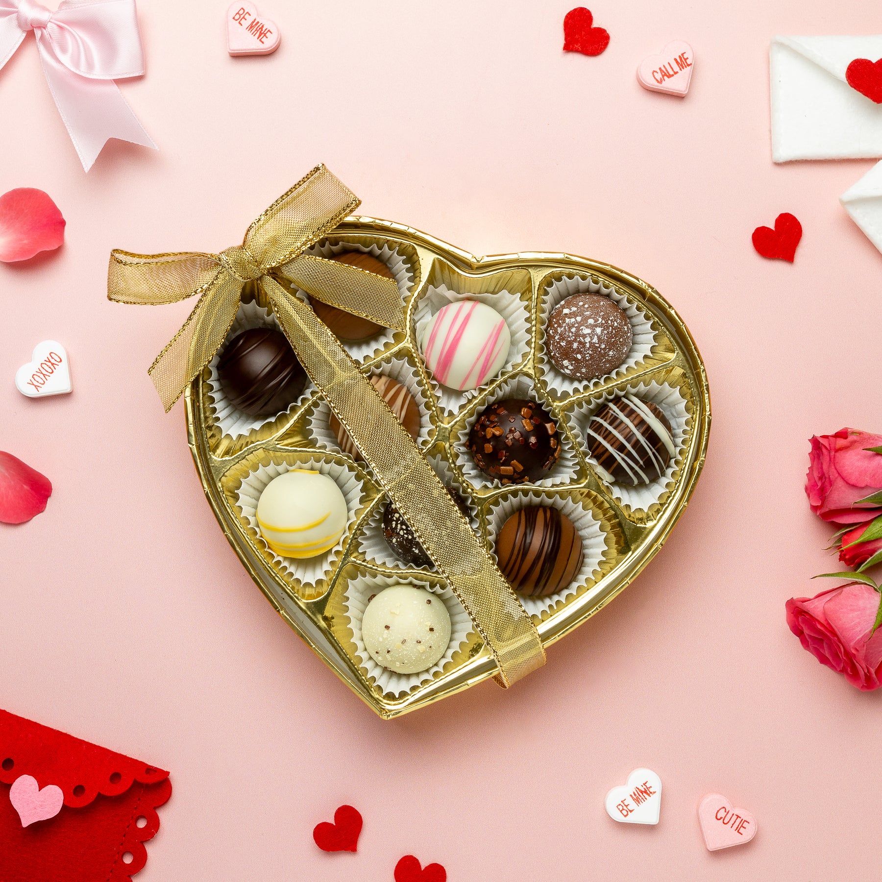 Indulge in Enjou's Truffle Collection this Valentine's Day with an elegant gold heart box, filled with decadent truffles in assorted flavors. Treat your loved one to a luxurious and delicious gift, perfect for celebrating your sweet love.