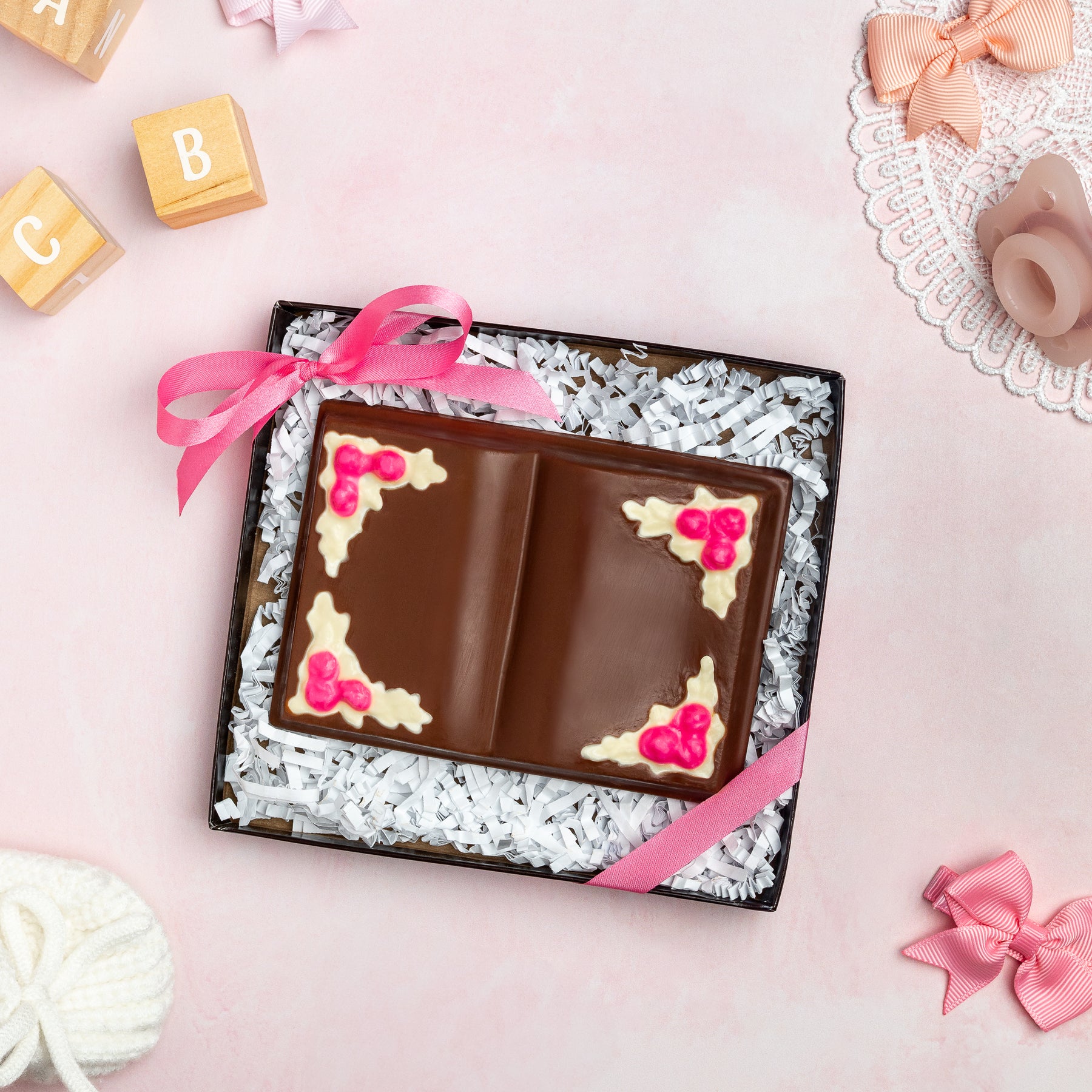 A chocolate baby book makes a great baby announcement or gift to celebrate the arrival of a little one! Measures approximately 3.75 inches long and 4.5 inches wide.