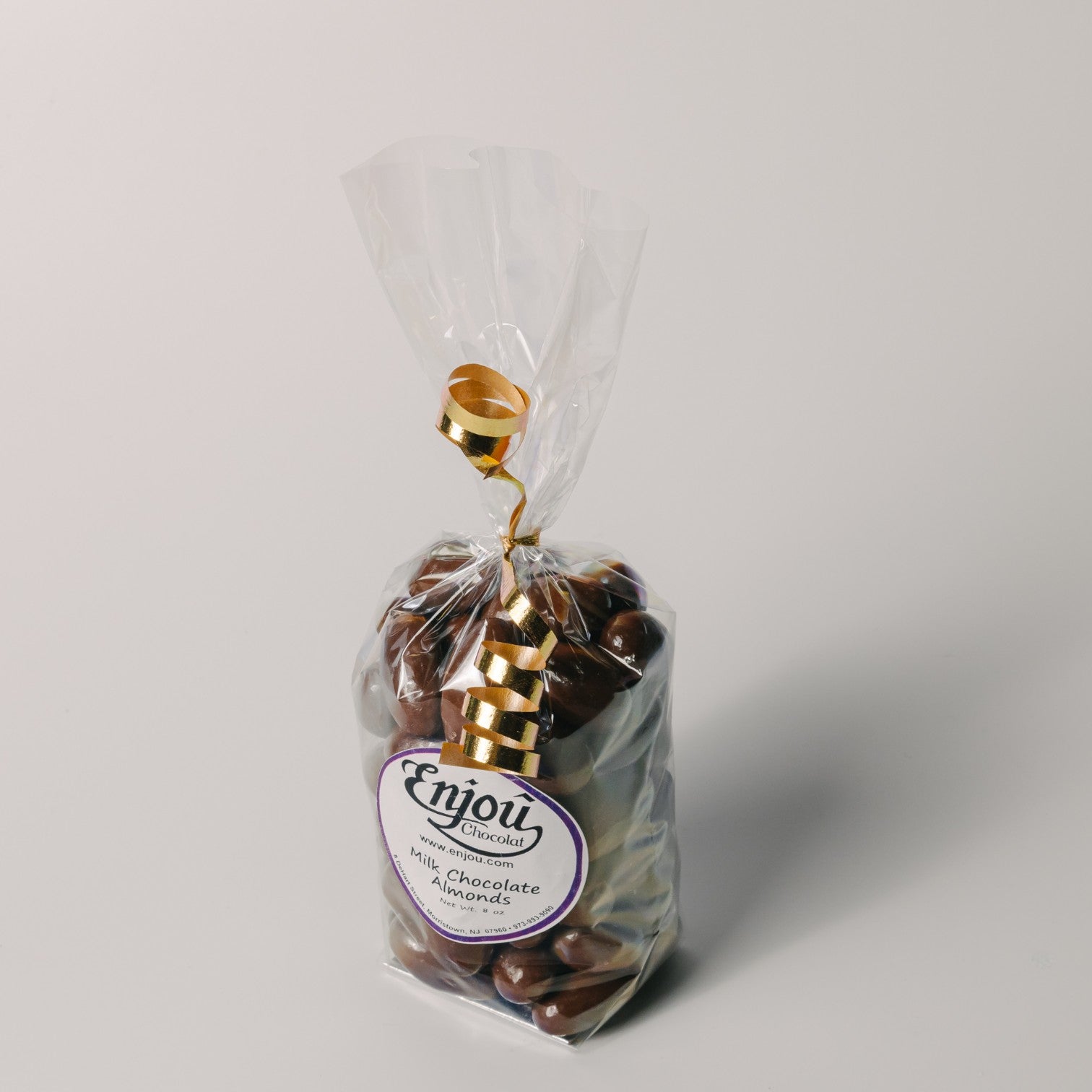 Indulge in a playful twist on a classic snack with Enjou's chocolate covered almonds. Satisfy your sweet and salty cravings with rich milk or dark chocolate and crunchy almonds. Perfect for snacking, gifting, or adding a delicious touch to your day. Each bag is approximately half a pound.