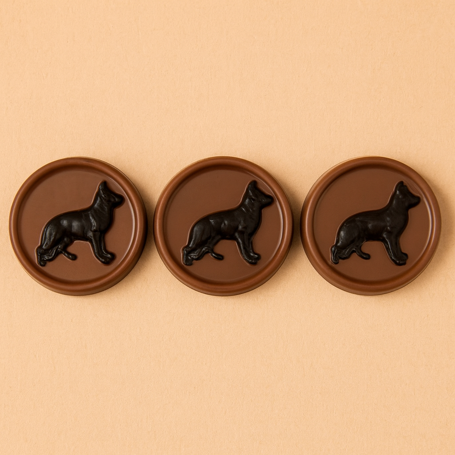 The German Shepherd is also known as an Alsatian. This breed of large sized dog originated in Germany. The chocolate version originated at Enjou! Each measures approximately 2.5 inches in diameter