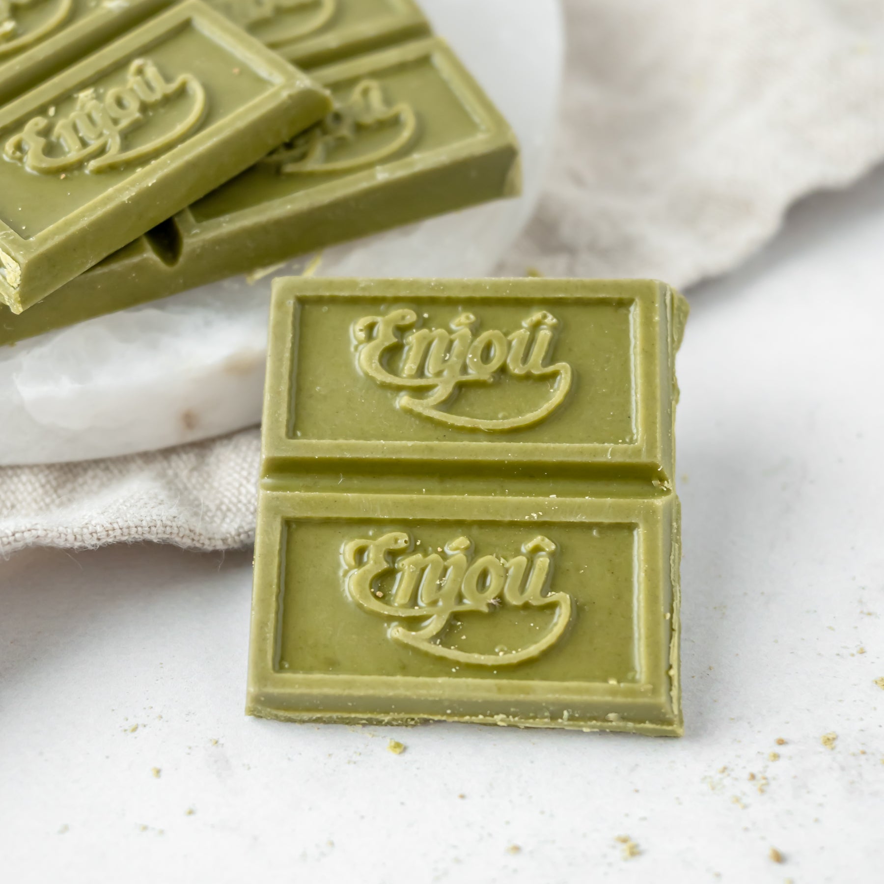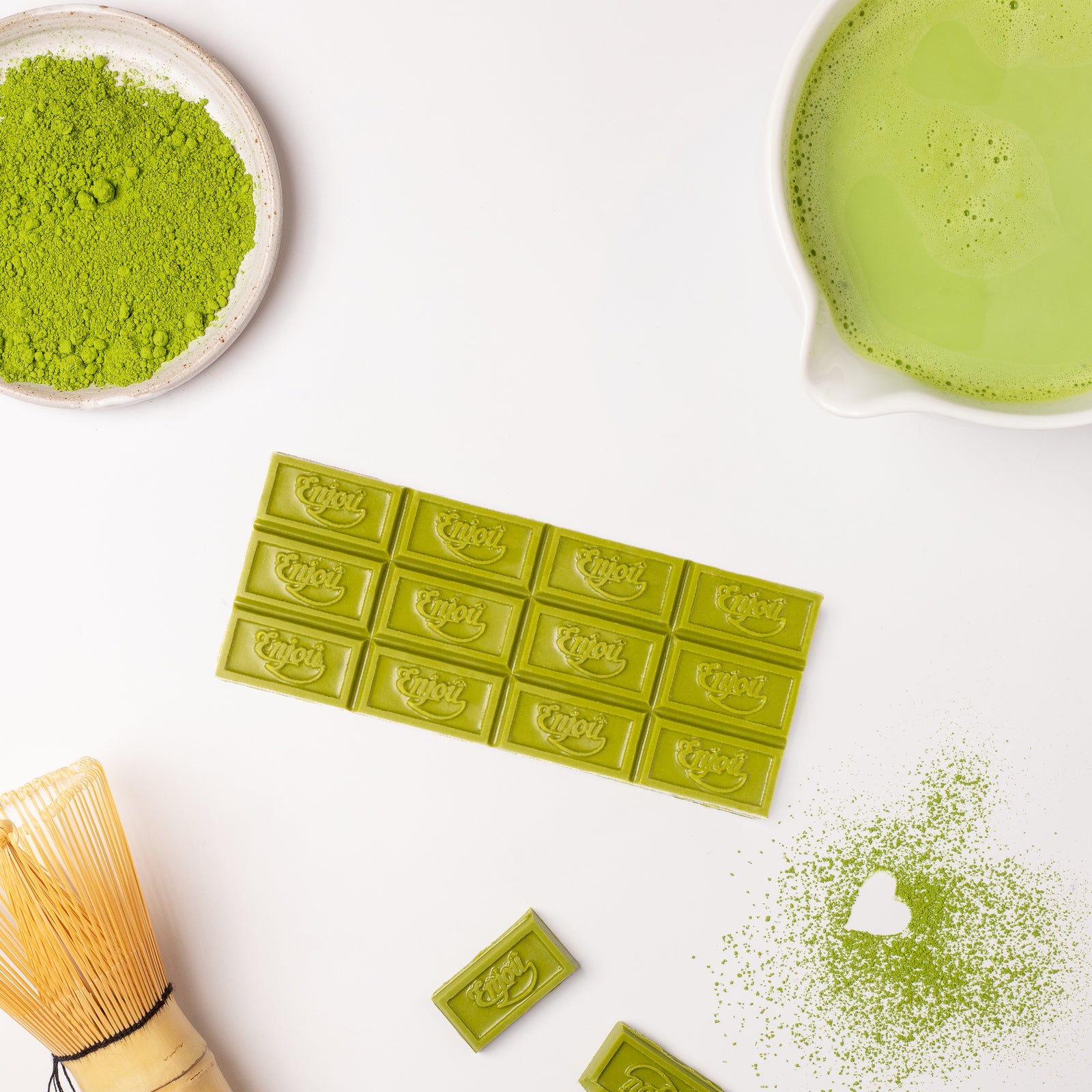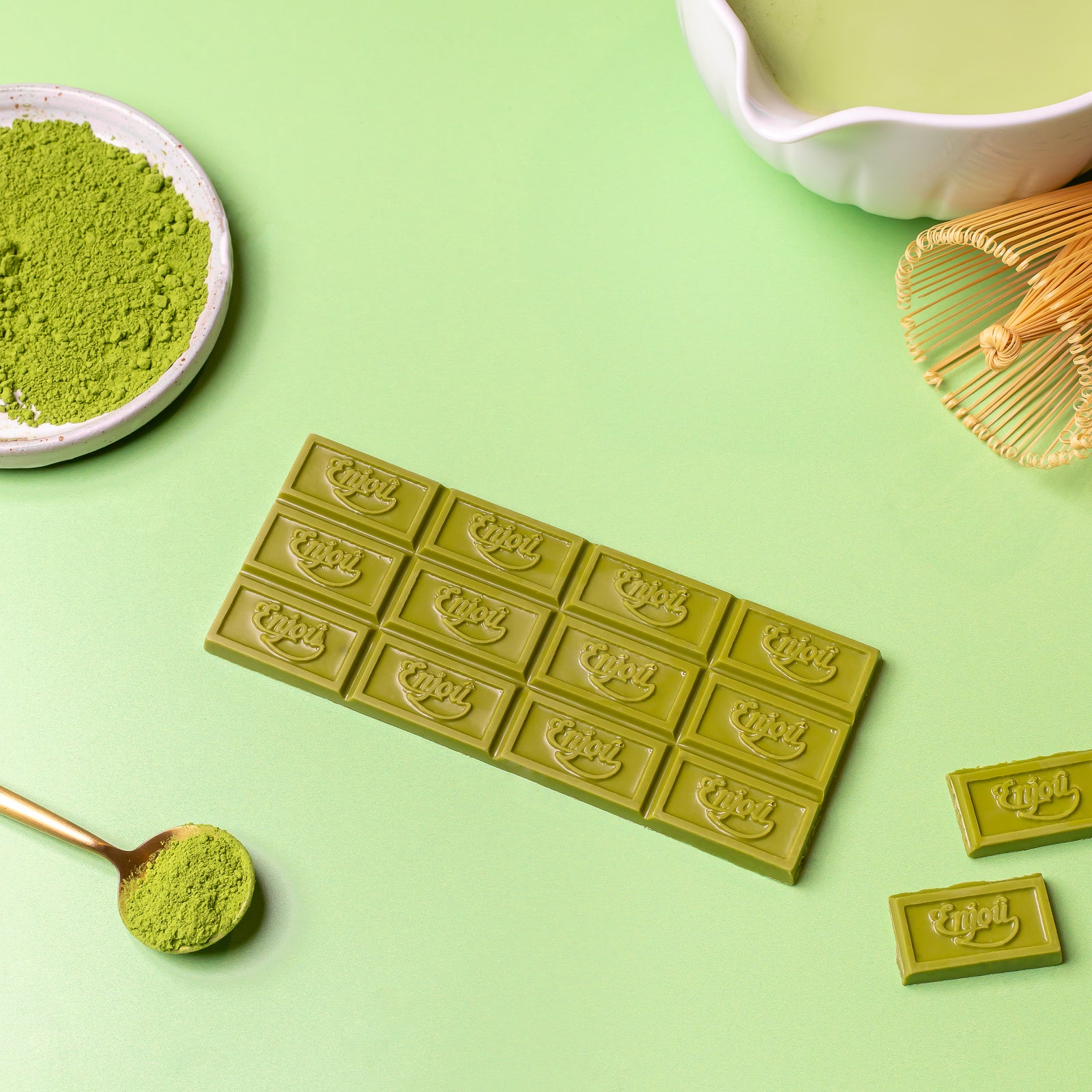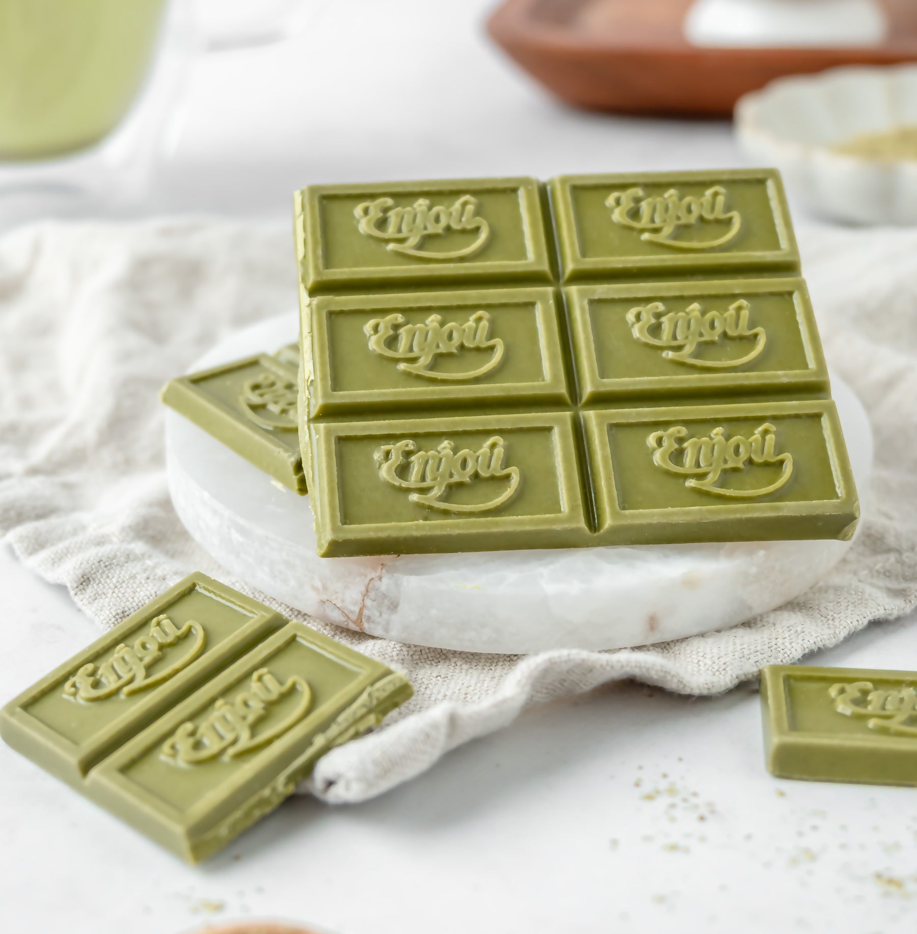 Indulge in Enjou's matcha bar, a refined fusion of premium matcha and velvety white chocolate. This sophisticated confection balances the complex, earthy undertones of ceremonial-grade matcha with the delicate sweetness of high-quality white chocolate. Perfect for matcha lovers and chocoholics alike!